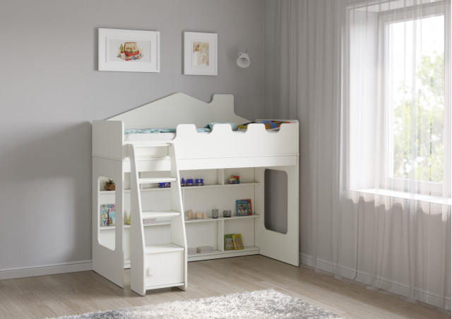 Лестница с дверцей облегчает доступ на спальное место и обеспечивает безопасность, а вместительный стеллаж позволяет хранить игрушки и другие вещи. Игровая зона под кроватью делает данную модель особенно привлекательной для маленьких пользователей. Борта, обработанные мягким  противоударным кантом,  и отсутствие острых углов делают использование кровати еще более безопасным.