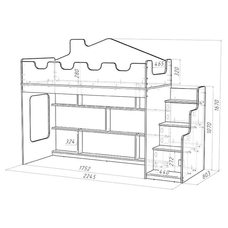 Угловая лестница с тремя дверцами обеспечивает комфортный и безопасный подъем к спальному месту и дополнительные места хранения. Вместительный стеллаж под кроватью предоставляет дополнительное пространство для хранения различных предметов и игрушек.
