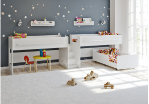 • Составная трехъярусная кровать – это две или три кровати, стоящие рядом. Такой комплект может состоять из двухъярусной кровати и кровати-чердака, что дает определенное преимущество в виде игровой зоны под одним из верхних спальных мест. В этом случае все места для сна параллельны друг другу и находятся на одном и том же расстоянии от стены. Также можно составить трехъярусную кровать из трех кроватей: двух чердаков и низкой кроватки, которая отлично вписывается под одним из чердаков. Зачастую нижняя кровать располагается перпендикулярно, что, с одной стороны, освобождает дополнительное место под чердаком, а с другой – перекрывает часть места, так как кровать выдается вперед. Данный набор отлично вписывается по двум прилегающим стенам комнаты, как угловой.